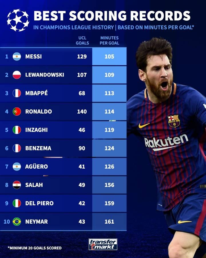 欧冠之王!梅西的欧冠进球效率历史第一!C罗第四!